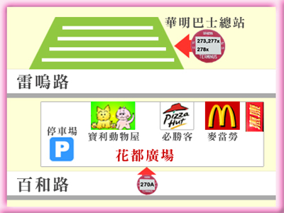 地址: 粉嶺百和路88號, 花都廣場, 地舖123號 (華明巴士總站對面)